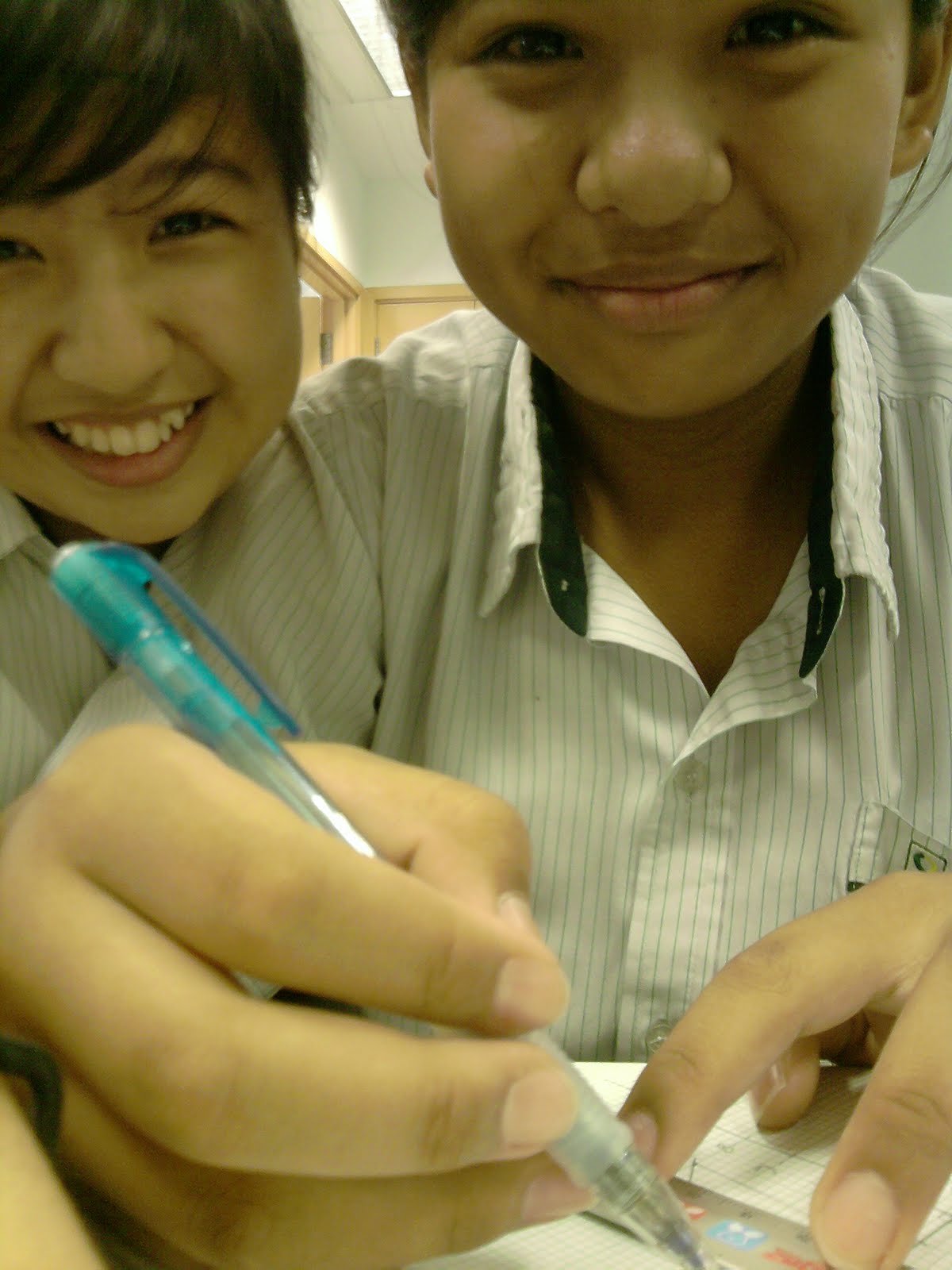 wello peeps! haven't been posting in awhile. didnt want to today, actually. but am so :) haha! anyway, i guess things are working out between me nd him now? haven't gotten the chance to talk & meet him. but we kept on messaging just now. so, idontknow :o . anyway, so he said he had a dream about me nd all. sighh. i had one too. but both dreams were different. i won't say what was the dream :) hehh! so, currently posting & uploading a few photos on Facebook! tagging peeps too. hehh. sighhh. i think i'm fallin' for him again. sighhhs! D; but ohwell. boredom! so, on Wednesday & Thursday, spent the days with Sasi, Hema & Priscilla! (: thnks alot, Darls! heheh. cause Mi went for camp. dangg. D; but she's back today! :) but has training again! D; what bummers, right, peeps? sighhs. anyway, i wanna thank Sasi, Hema & Pris for everything! so today, did nothing much. but i did well for my arts, for me. :) i paid attention to my work though, not the teacher :) anyway, chatted with Pris & Sasi. sighhh. god, i miss him. nd to Bby Eera, thnks SO much. i ♥ you! thnks for helping me with him, well, EVERYTHING that you've done. i really ♥ you ubber much! :') oooh~ yay! i just got "barkat jumaat". i'm sory to the non-malay peeps reading. haha. i dont know how to say it in english! hmmm. :) eventhough it's only $2, it's still money. hehe! nd now i'm eating a banana. hahah! :P oh, my hair is in two. like, two ponytails, yknow? hehh. :) anyway, i'm gonna post up some photos here, alright? :) it's from today's. enjoy, Darls.